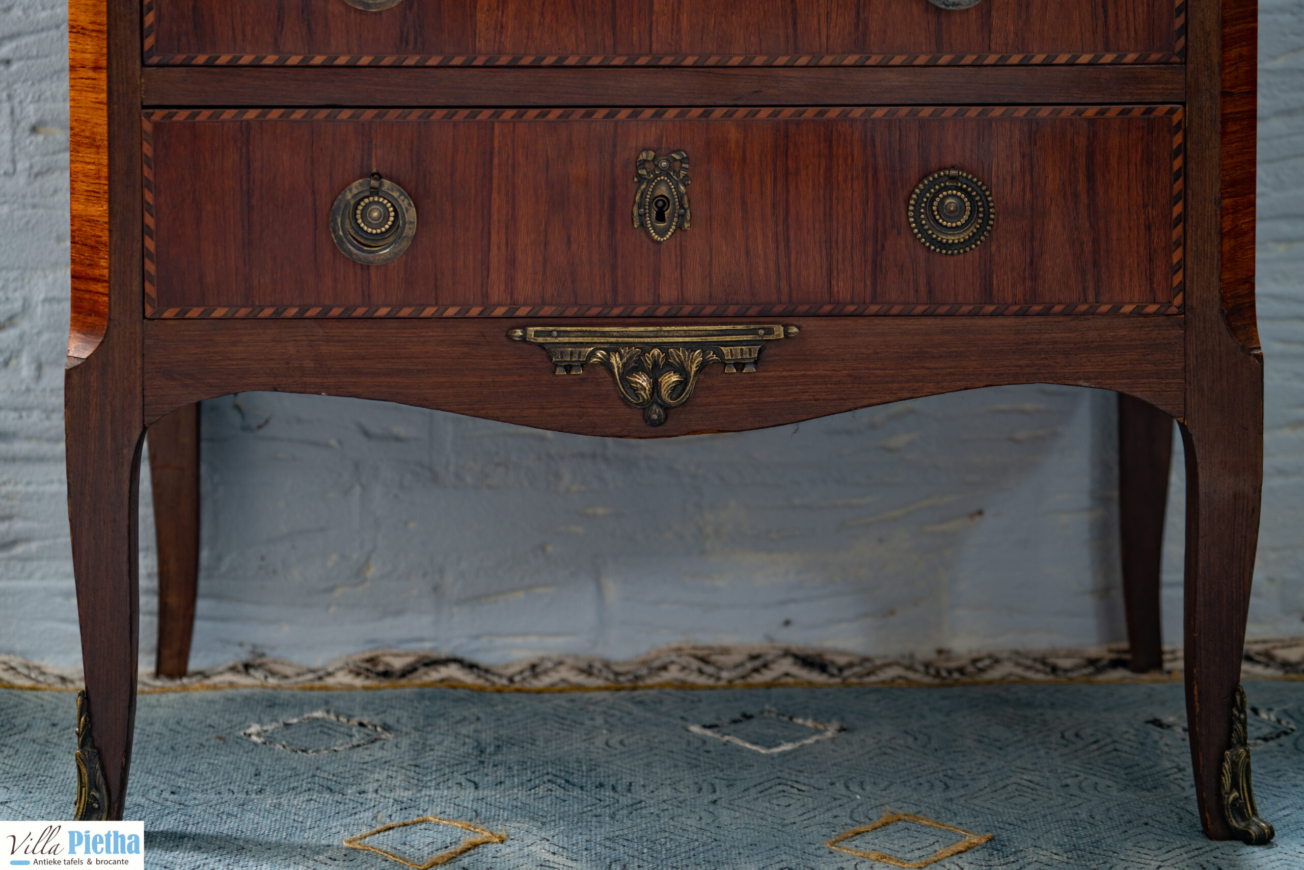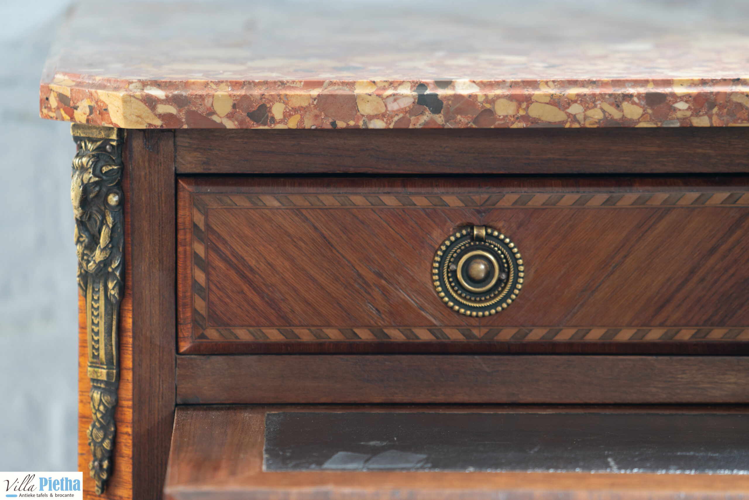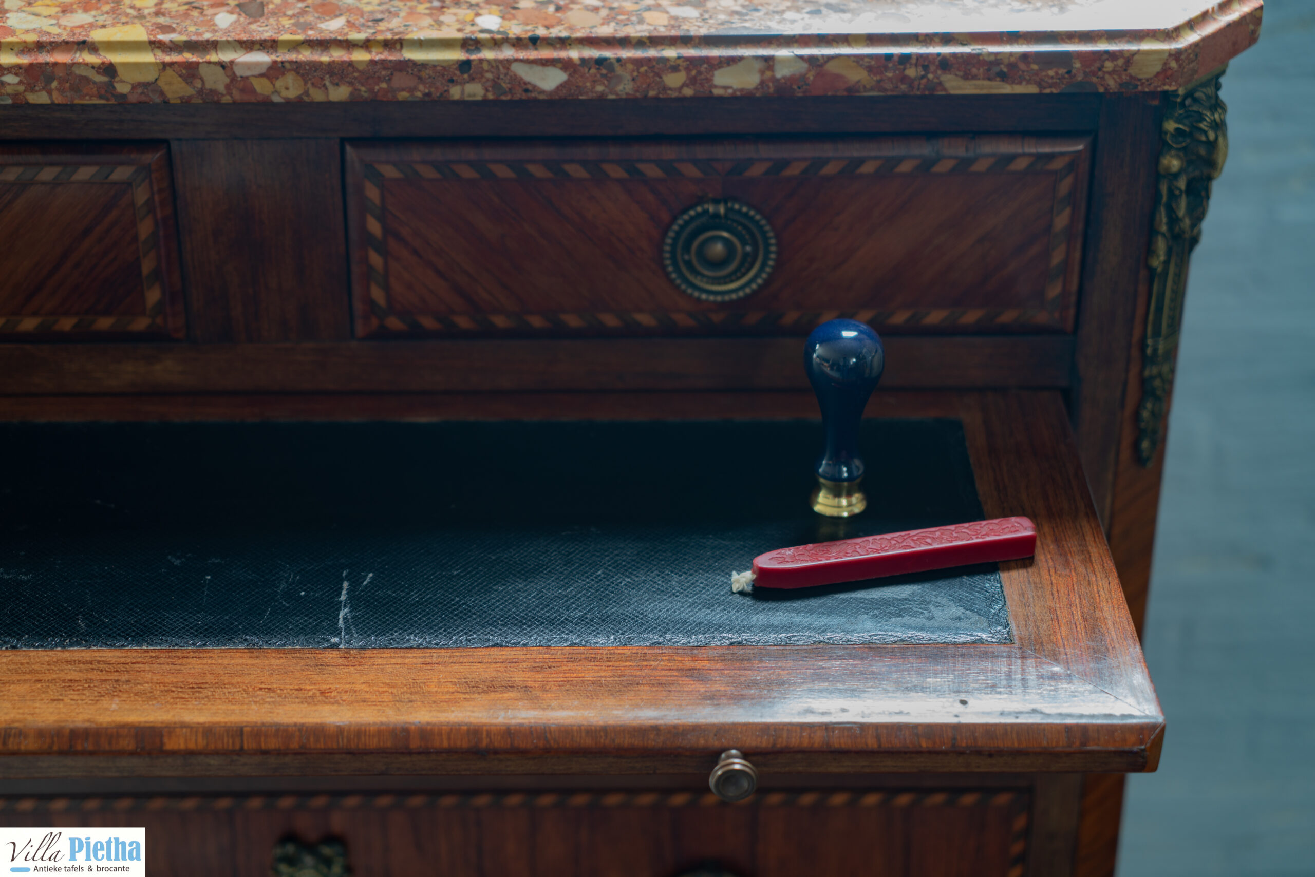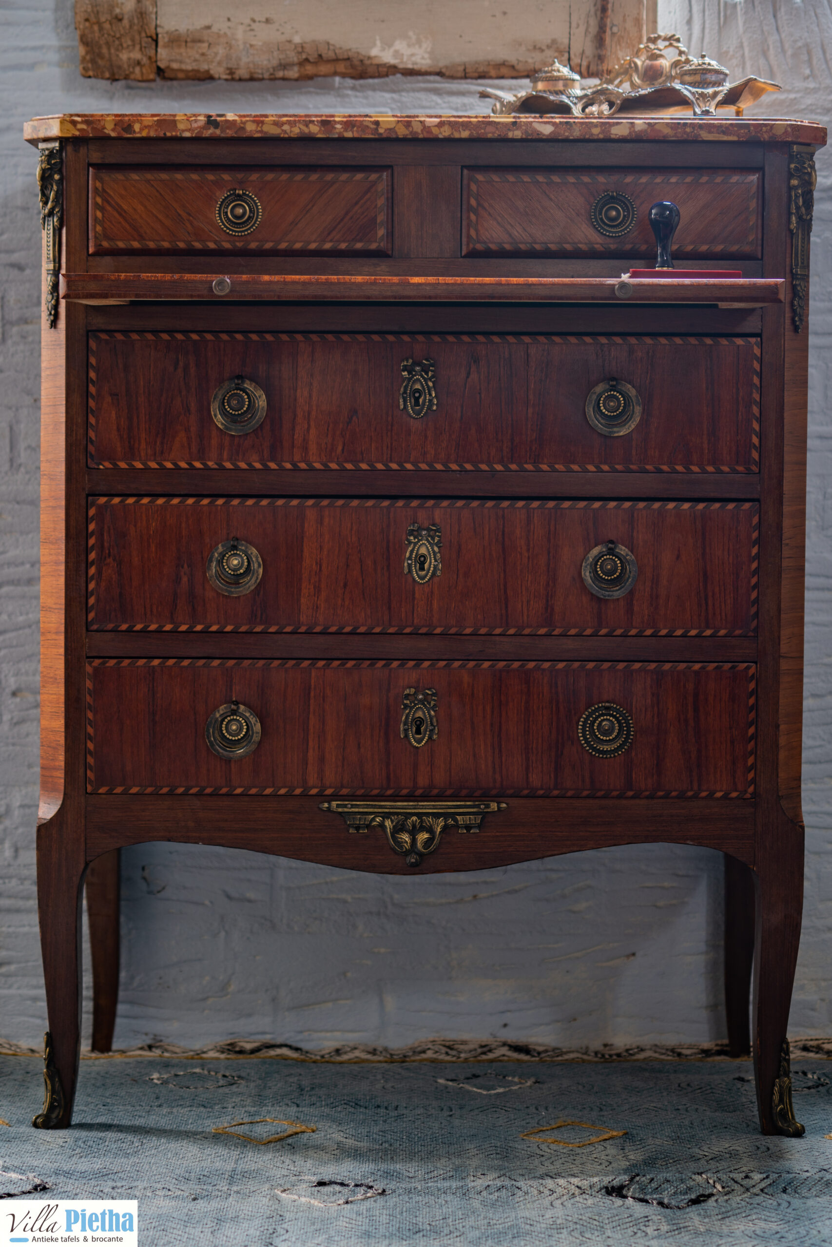 Erg charmant kastje met prachtige details. Het is een antieke commode met schrijfgedeelte. Het schrijfgedeelte is bekleed met zwart leder en heeft erg mooi inlegwerk. Daarnaast mooie messing details en een marmeren blad. Elegant kastje dat een ruimte echt een upgrade kan geven.
