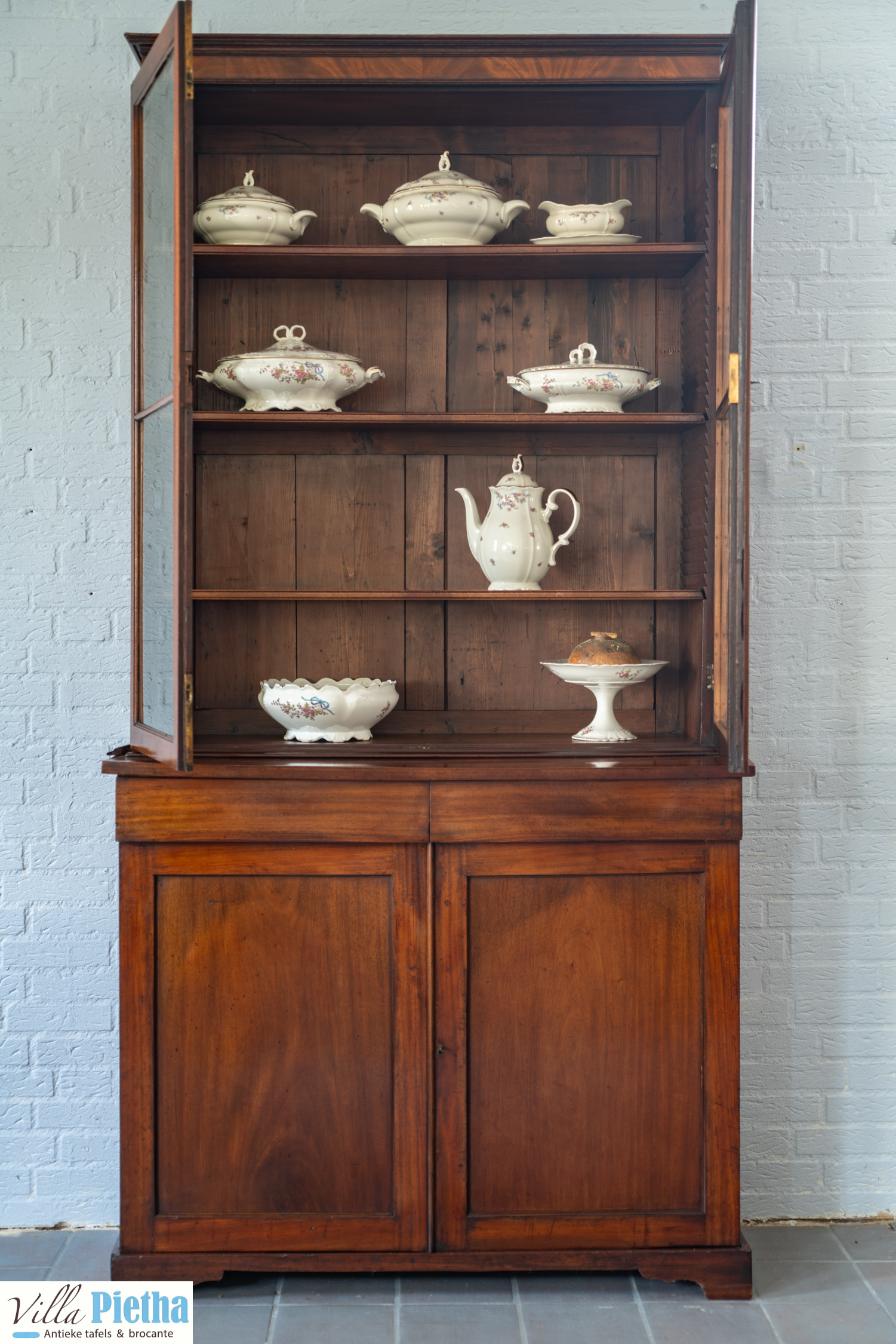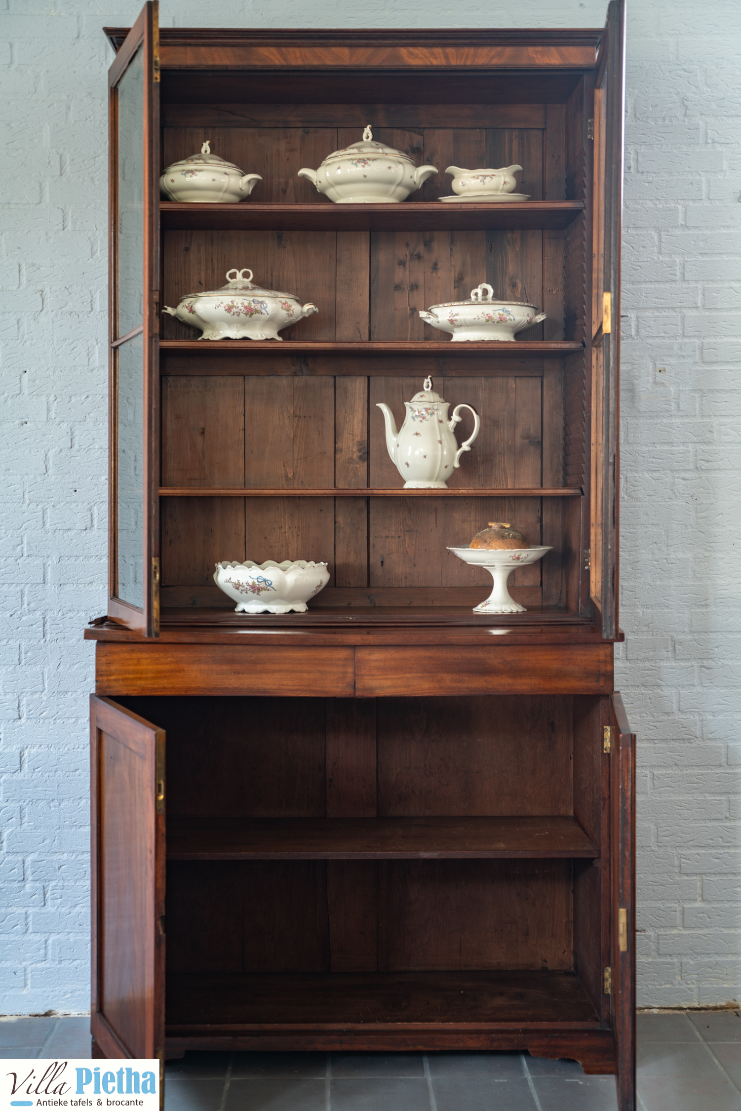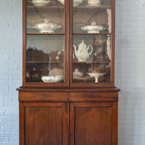 Naast tafels verkopen wij ook kasten. En zie hier, een prachtige antieke vitrinekast met nog het originele glas en ook nog het originele messing hang- en sluitwerk. Dat vind je bij onze Zweedse vriend niet. In zo’n item zie je weer het vakmanschap terug. Duurzaamheid van de bovenste plank. Gemaakt rond 1890, de tijd dat er nog geen fineer werd gebruikt en ook het ruitglas nog geblazen werd. Dit zie je echt terug in deze kast. Erg leuke kast voor in de keuken om je mooie servies in uit te stallen. Of in de werkkamer als bibliotheekkast. Dit is een kast die met je mee verhuist en altijd wel een plekje vindt in je interieur. Door het praktische formaat komt de kast op veel plekken goed tot z’n recht.